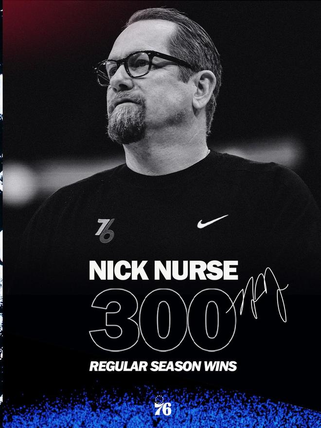 纳斯喜提执教生涯常规赛第300胜,76人官方发文祝贺